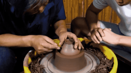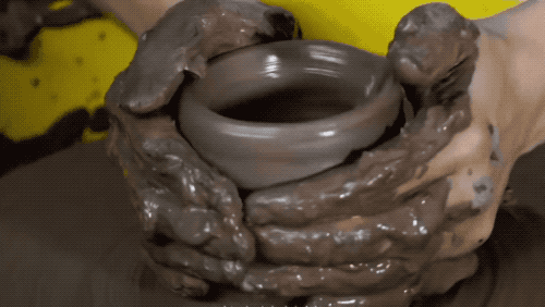 我国毕竟是瓷器大国,现在大家用陶器做碗已经是很少见了,真要做的话,也更多是在当地的陶艺馆,大家都把制作过程当做一种休闲活动来开展......如果有现成的陶器用泥,那就直接开始拉坯环节,做碗的造型了。泥巴干了就滴点水,水多太软就晾一晾......看着底下平台转,只需要用手扶着捏碗会省力?不,真上手晃的很......新学制陶的学徒,是光拉胚就要学几年的。