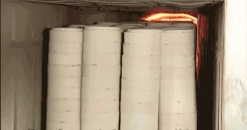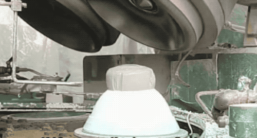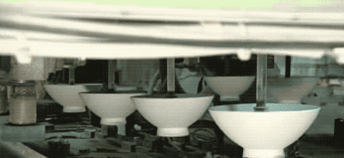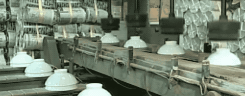 此时还是泥料的瓷器饭碗要经过干燥隧道,烘一烘后,把泥碗的水分控制一下。出来的泥碗就不再是一捏就软了,已经可以用负压进行吸取运输了。