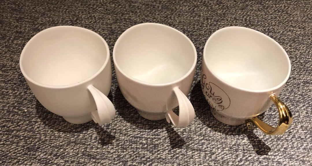 现在需要把定了型的泥碗送去烧制,但并非只烧一次。我们 18 年还抽奖过不同烧制阶段的瓷器,像下图从左到右是经过了三次烧制的,分别是泥料烧成的素胚,上釉料后再烧出了光泽的白瓷胎,最后是用了转印贴的图案,再烧制成的最终品。