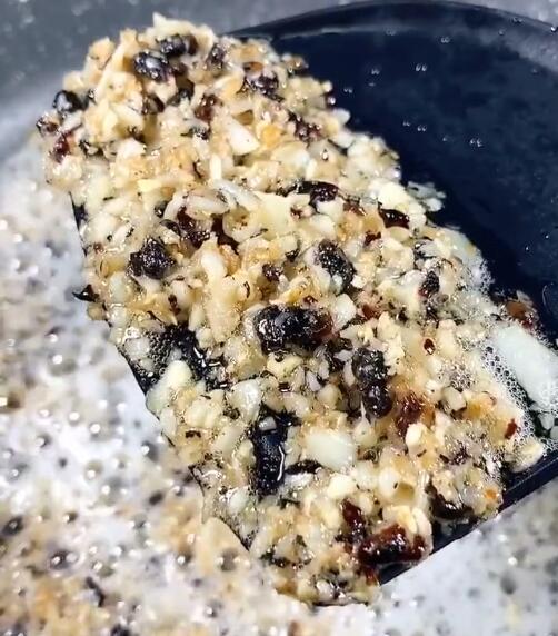 3、起锅,锅中倒入适量食用油,油热下入剁碎的蒜末和豆豉,开小火不断翻炒至蒜末微微发黄后盛出装入碗中备用,记住一定要开小火,否则很容易炒焦了,影响口感;