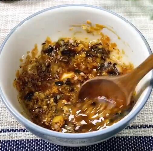 4、再调制一碗料汁,炒好的豆豉蒜末中加入两勺生抽、一勺蚝油、少许白糖,用勺子搅拌均匀,料汁就调制好了,放置一旁备用;