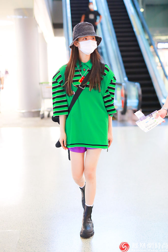 杨超越身穿Angus Chiang绿色条纹Polo裙,展美少女活力。