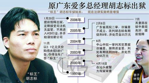 2000年,正值而立之年的胡志标因票据诈骗、挪用资金等罪被逮捕入狱,一审被判20年,后经上诉,改判为8年。2006年,胡志标由于在狱中表现良好,提前获得假释