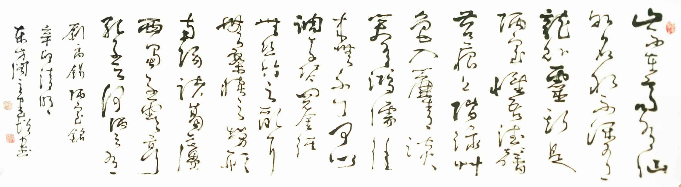 观察傅建增擅长的行草书作品,可以看出他的作品结构十分严谨,可以说是奇中求正,险中求平,很是精彩,使转顿挫随心而运,寓柔而刚,劲健绰约;结体章、今互用,纵横开阖,曲之中险夷相生;布白一气贯通,字行间辑让有序,顾盼多姿,密处见凝重,疏处显神韵,笔法古拙灵动,苍劲洒脱,书卷气息浓郁。
