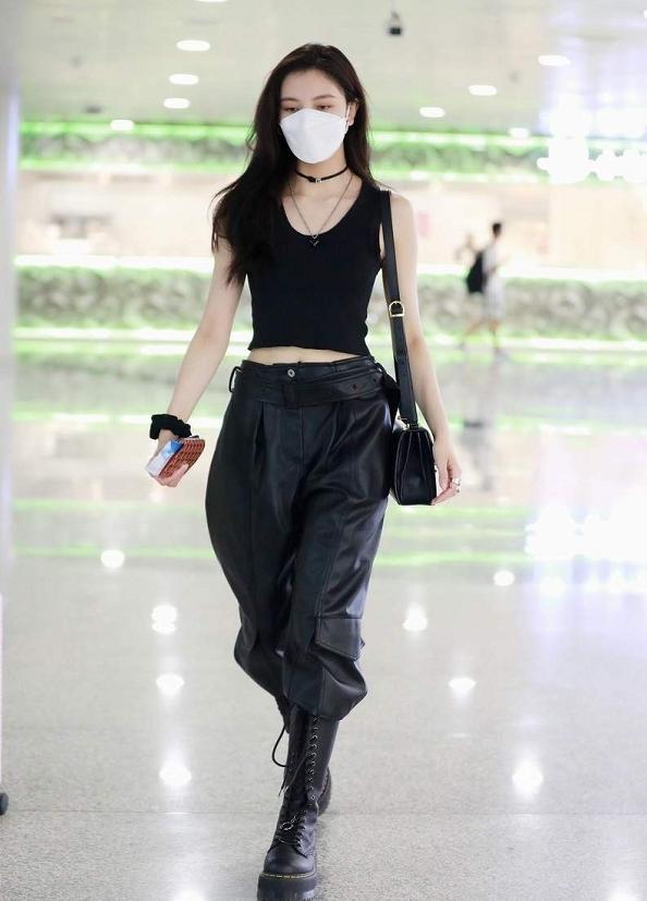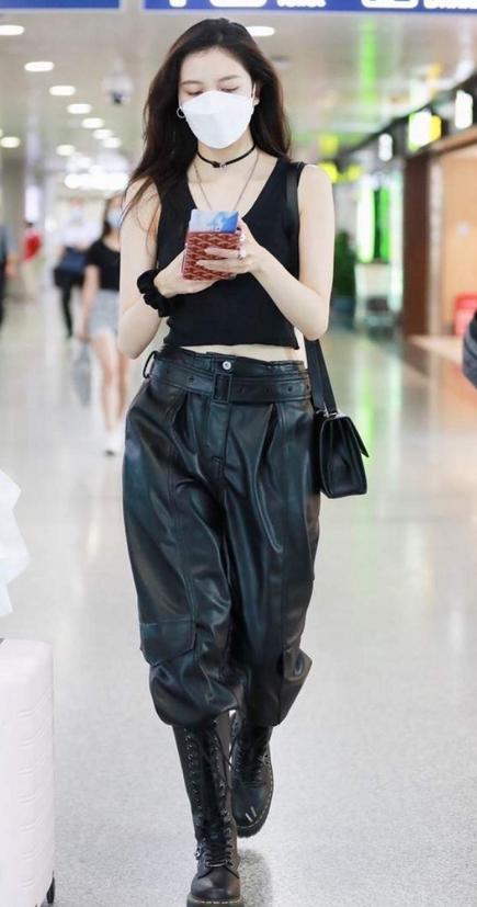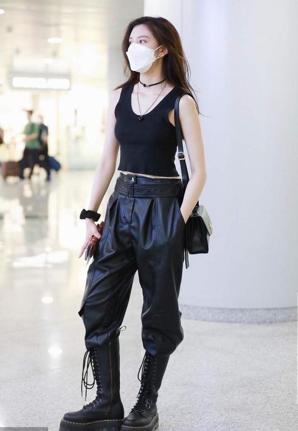 宋妍霏身穿黑色背心和皮裤的造型是在机场的街拍当中,她选择了全黑的look出镜,而且还搭配了她最喜欢的马丁靴,经常关注宋妍霏穿搭的小伙伴应该都知道,宋妍霏最爱的单品是马丁靴,搭配工装裤或者是牛仔裤穿都特别的时髦个性。