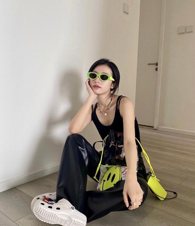 黑色背心和皮裤都是属于基础色而且很基础的款式,周雨彤很会穿,她选择了在配饰上加入小心机,简单的低扎马尾发型加上荧光绿色的包包以及墨镜,立马让原本一身很沉闷的造型变得时尚吸睛起来,配饰在造型当中起到了大大的作用啊。