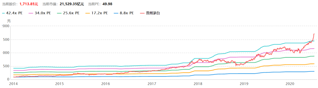 我们以股王贵州茅台为例,2015年巅峰时,贵州茅台估值(PE)也就20倍,现在是多少呢?50倍。也就是说,别看贵州茅台现在市值有2.15万亿元,但按照2015年的估值计算的话,茅台市值也就8600亿元,剩下的1.29万亿都是估值提升带来的结果,说句不客气的话,这是泡沫。