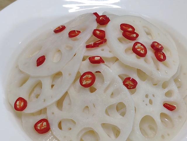1、准备好以上所有食材,将小米辣去蒂切成小段,莲藕去掉两端,用刮皮刀去掉莲藕外皮,洗净后切成片(不要切太厚,不然不容易入味,2mm左右厚度即可),清洗掉藕粉后放到装有清水的碗里浸泡,加少许白醋,多了这一步骤,可以防止藕片被氧化变黑;
