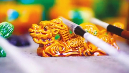 苏永军介绍:“琉璃制作是一门综合技艺,要经过备料、成型、素烧、施釉、釉烧等几个阶段。首先就是塑形,这个要求很严苛。”他指着正在塑形的一头琉璃狮子说:“第一要把狮子的面部突出来,两只眼睛必须对称,每个部位的轮廓、纹理要清清楚楚。其次就是素烧,经过1180摄氏度高温烧制成白色坯胎,再上釉色,经过950摄氏度的烧制,就成了现在看到带颜色的琉璃。”
