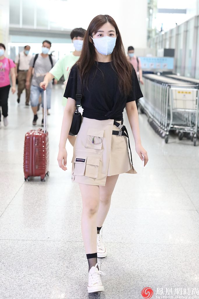张含韵穿黑色T恤搭配工装短裙,装扮新潮变硬核酷girl。