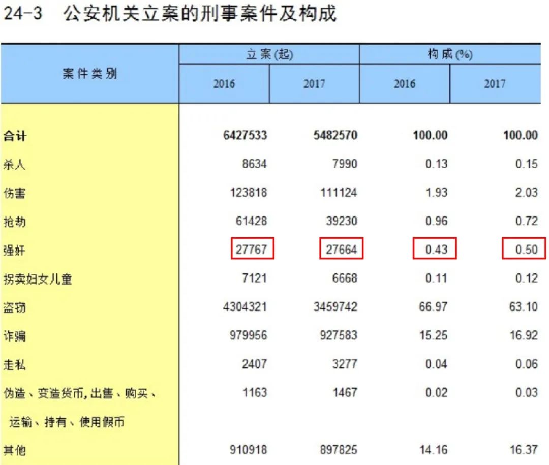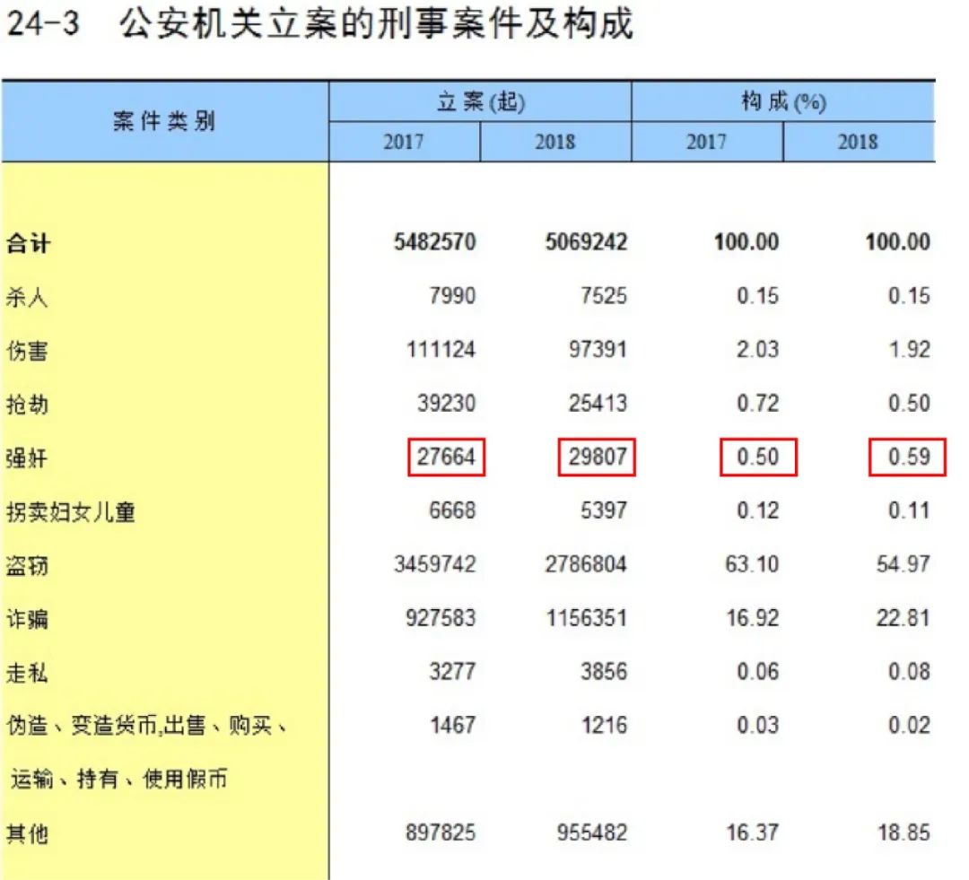 数据事实是残酷的,在2016-2018年公安机关立案的刑事案件构成中,强奸案的立案数从2016年0.43%的到2017年0.50%,而2018年则上升到了0.59%。