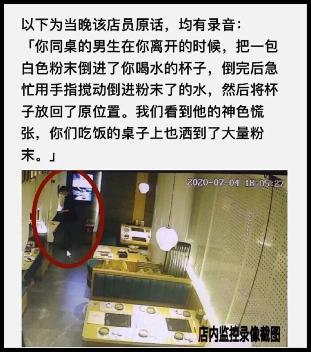 这个男生下药时候的情景全被店家拍了下来,水杯里的药和桌子上的粉末,都证据确凿。