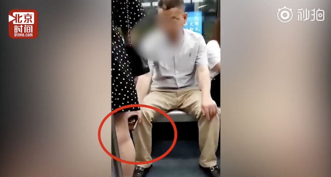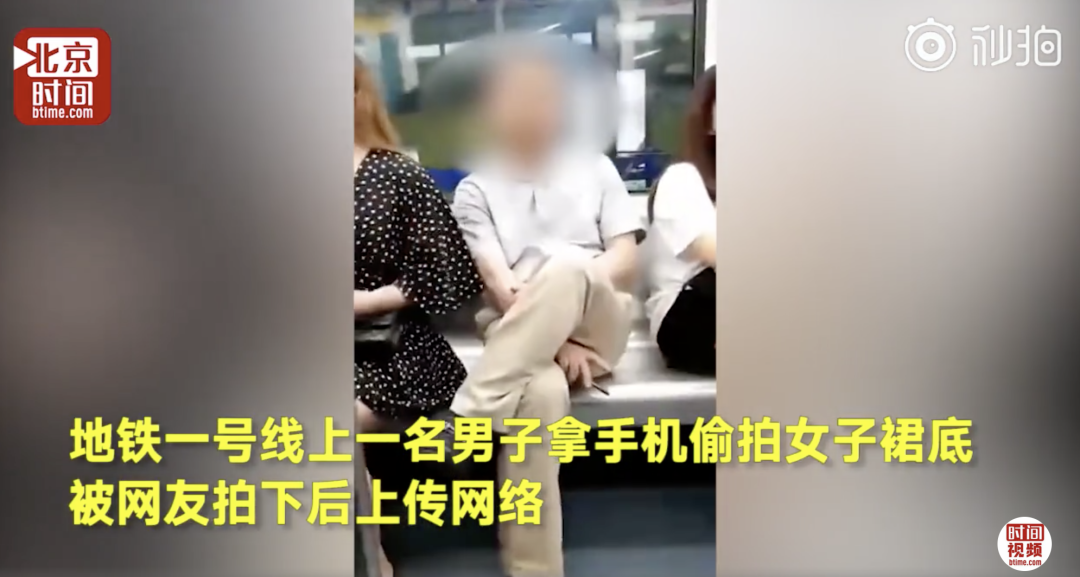 在成都地铁,有一个衣冠楚楚的大叔,在车厢内公然用手机偷拍女生裙底。