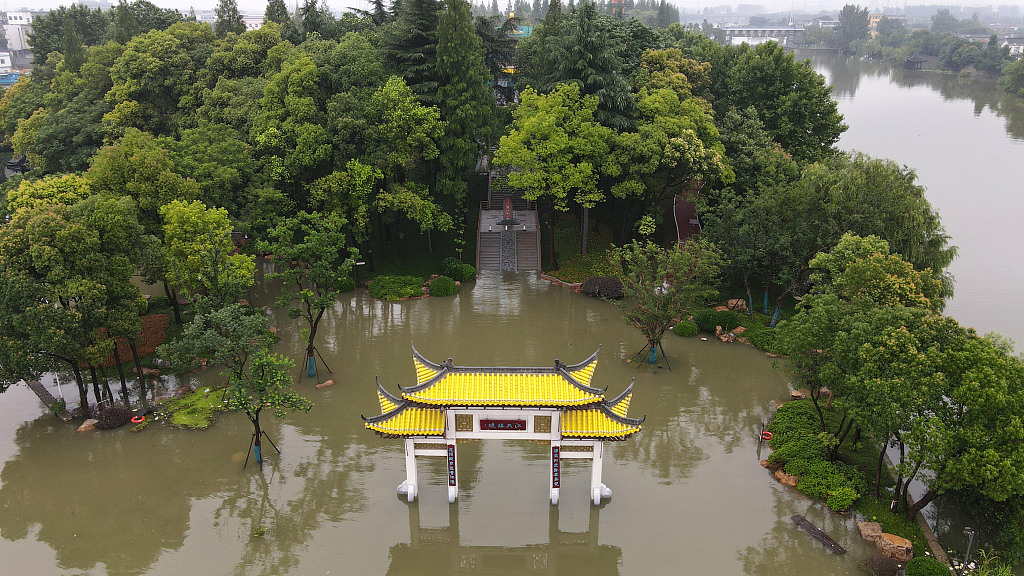 2020年7月19日,受降雨影响,“长江2020年第2号洪水”于17日在长江上游形成,长江扬州段水位出现明显上涨,部分地方被水淹,沿江的公园、码头等旅游景点暂时关闭。图为瓜洲古渡公园被上涨的江水淹没。
