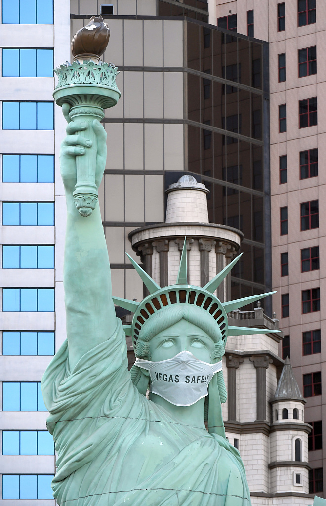 当地时间2020年7月20日,美国拉斯维加斯一酒店外的自由女神像的复制品被人戴上口罩。Ethan Miller/视觉中国