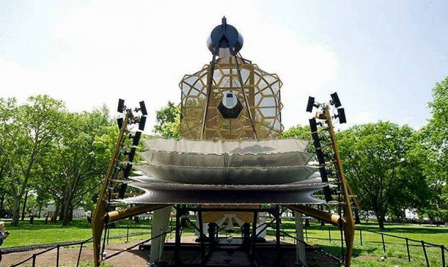 2010年世界科学节期间,詹姆斯·韦伯太空望远镜的巨型模型在曼哈顿炮台公园城亮相。查尔斯·莫斯托勒/巴克罗夫特美国/盖蒂图片社