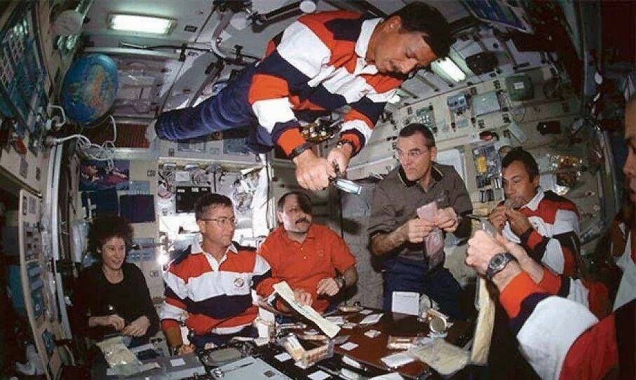 2001年,来自三个不同国家的宇航员在国际空间站共进午餐。百科全书/ 乌伊格 /盖蒂图片社