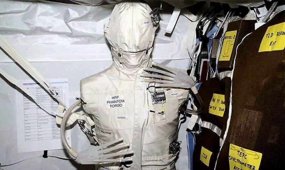 摄于国际空间站(2001年)的幻影躯干,是用来测量辐射对人体内部器官的影响,它使用的躯干类似于地球上用来训练放射科医生的躯干。美国宇航局通过盖蒂图片社