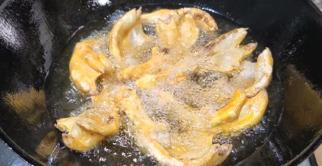 3、焯好水的鸭脚用厨房纸巾将其表面的水分吸干,然后起锅,倒入足量食用油,油温5成热的时候倒入鸭脚,开小火慢炸,炸至鸭皮表面鼓起大泡的时候控油捞出备用,继续加高油温,待油温升高至微微冒青烟的时候,下入鸭脚复炸一遍,复炸20s左右就可以了,经过复炸使鸭脚表面更加蓬松,炸制好的鸭脚控油捞出立刻放入冷水中浸泡20分钟,使鸭脚表皮胀发,这样更容易入味,口感更好;