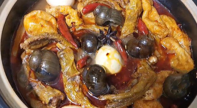 食材准备:田螺、鸭脚、炸腐竹、油豆腐条、鹌鹑蛋、生姜、小葱、大蒜、紫苏、酸笋、香菜、料酒、干辣椒、郫县豆瓣酱、香料(八角、桂皮、香叶、山黄皮)、生抽、蚝油、腐乳、盐、食用油