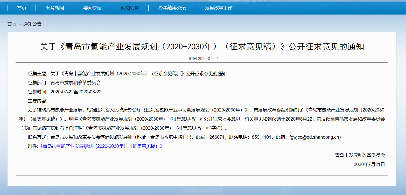 近日,青岛市发展和改革委员会发布关于《青岛市氢能产业发展规划(2020-2030年)(征求意见稿)》公开征求意见的通知,发展目标为在未来10年将青岛发展成为国际知名氢能城市,打造国内重要的氢能产业基地,实现“东方氢岛”的总体发展目标。