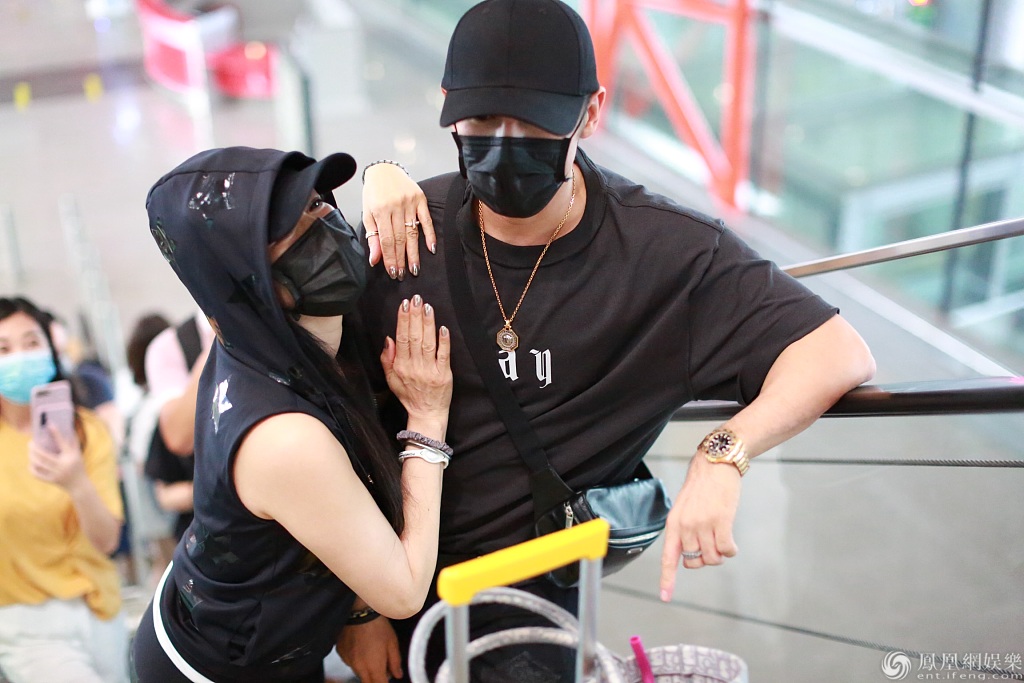 2020年7月26日,上海,钟丽缇与丈夫张伦硕现身机场。钟丽缇耸肩贡献表情包可可爱爱,与丈夫张伦硕穿情侣黑装,一路牵手有说有笑恩爱甜蜜。