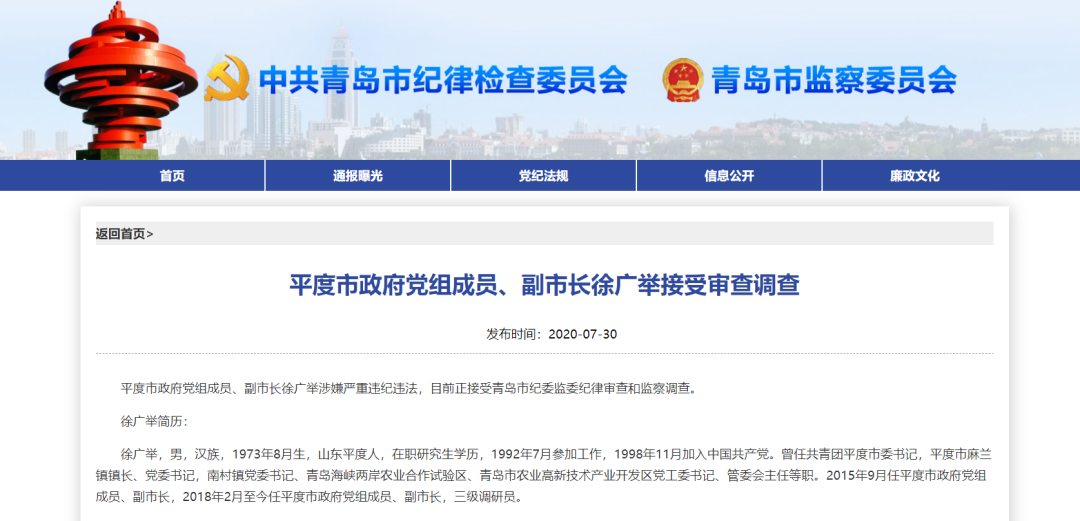 7月30日,据青岛市纪委官方通报,平度市政府党组成员、副市长徐广举涉嫌严重违纪违法,目前正接受青岛市纪委监委纪律审查和监察调查。
