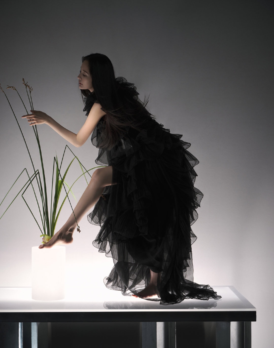 杨幂穿黑色纱裙光腿赤足,优雅神秘