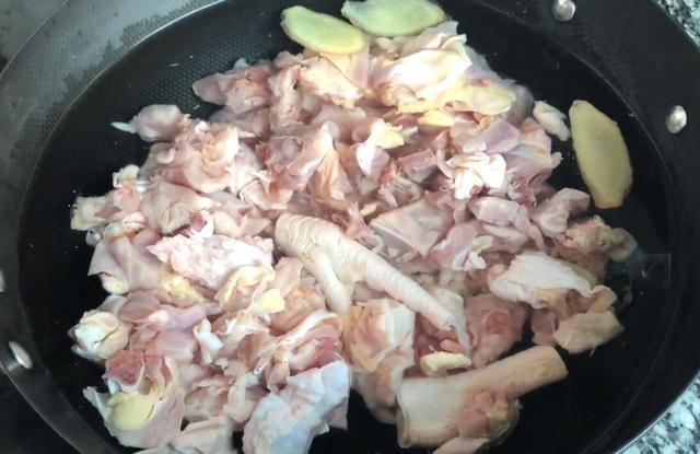 3、再次起锅,锅中倒入适量食用油,油热下入切好的姜粒、蒜粒、泡椒以及2颗八角和一小撮花椒粒,开小火不断翻炒出香味,随后倒入焯好水的鸡肉,不断翻炒将鸡肉表面水分炒干,炒至鸡肉表面略微焦黄的时候开始调味,加入适量盐、生抽、少量老抽,再次翻炒均匀上色;