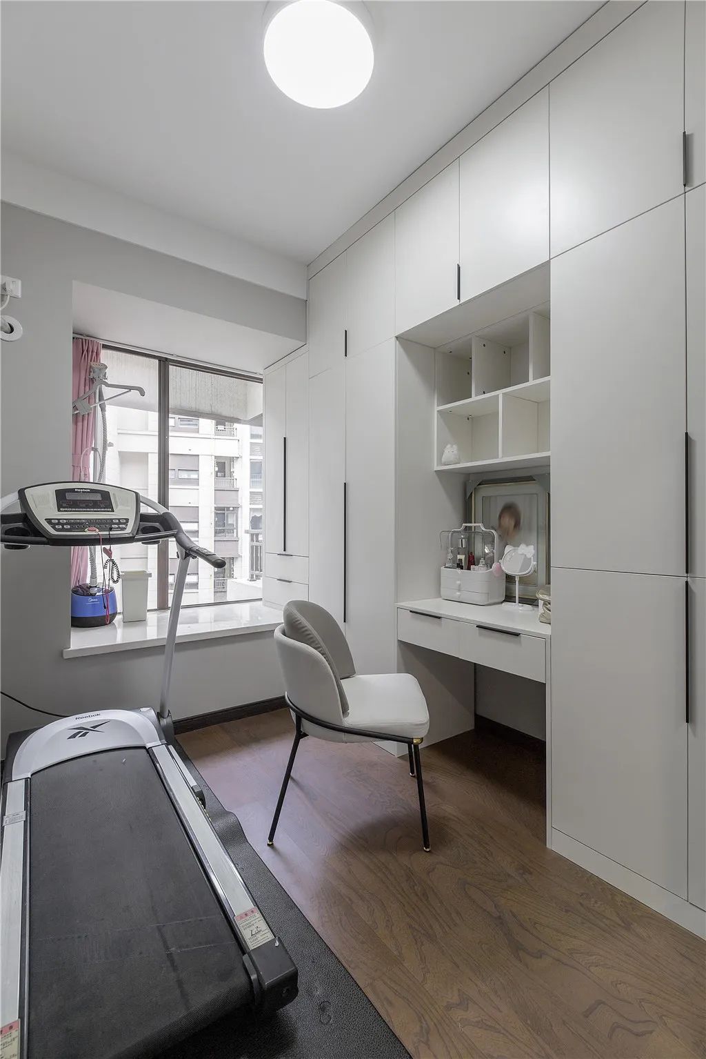 衣帽间是最实用的一间,实现了一间三用的空间,收纳柜中间加入一个梳妆台,还布置了健身器材