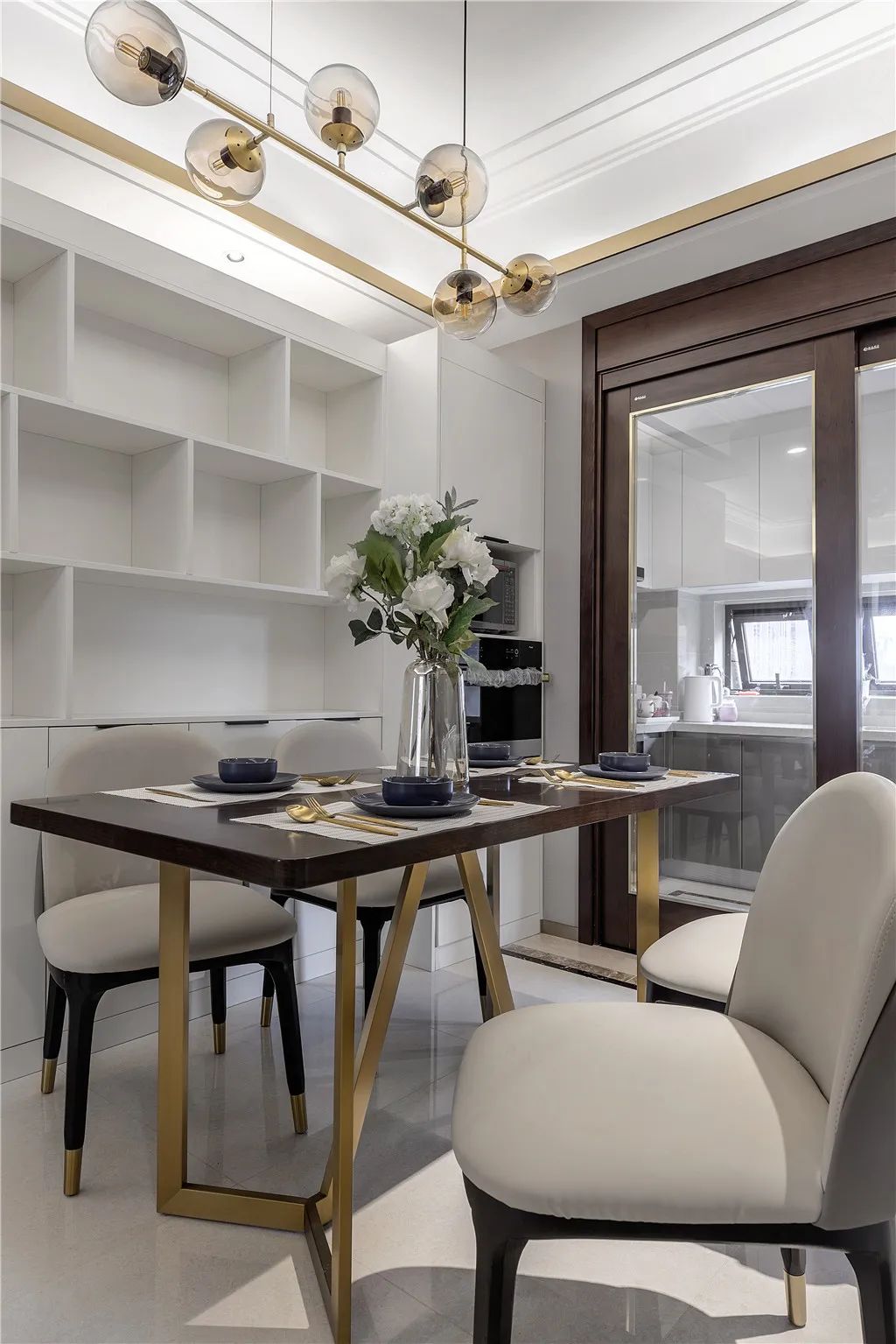 餐厅一整排定制开发式收纳柜,满足餐厅收纳需求,大理石餐桌非常有仪式感,茶色玻璃罩的球形吊灯,整个餐厅充满了高级优雅的设计。