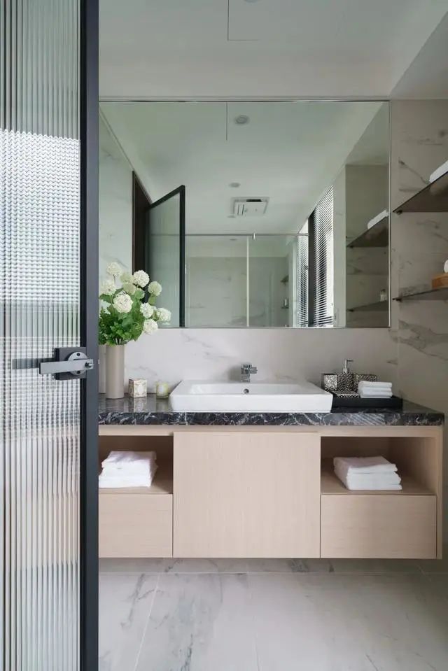卫生间的洗手盆以台上盆的设计,结合木质洗手盆柜,还有大尺寸的镜子设计,让卫浴空间也更加时尚华丽。
