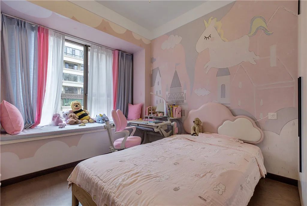 整个空间都是满满的少女粉,还有一张儿童书桌椅,整个空间被梦幻的童趣氛围充斥着,活泼而又情趣。