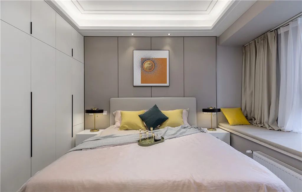 卧室粉色的床单与黄色枕头布置,还有环形的灯具,让睡眠空间充满浪漫雅致的情趣感。最棒的就是这个飘窗设计,提供了一个舒适的休闲角落。