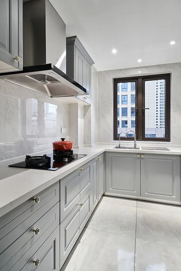 厨房采用米白色地砖,灰色厨柜,使整个空间干净整洁。