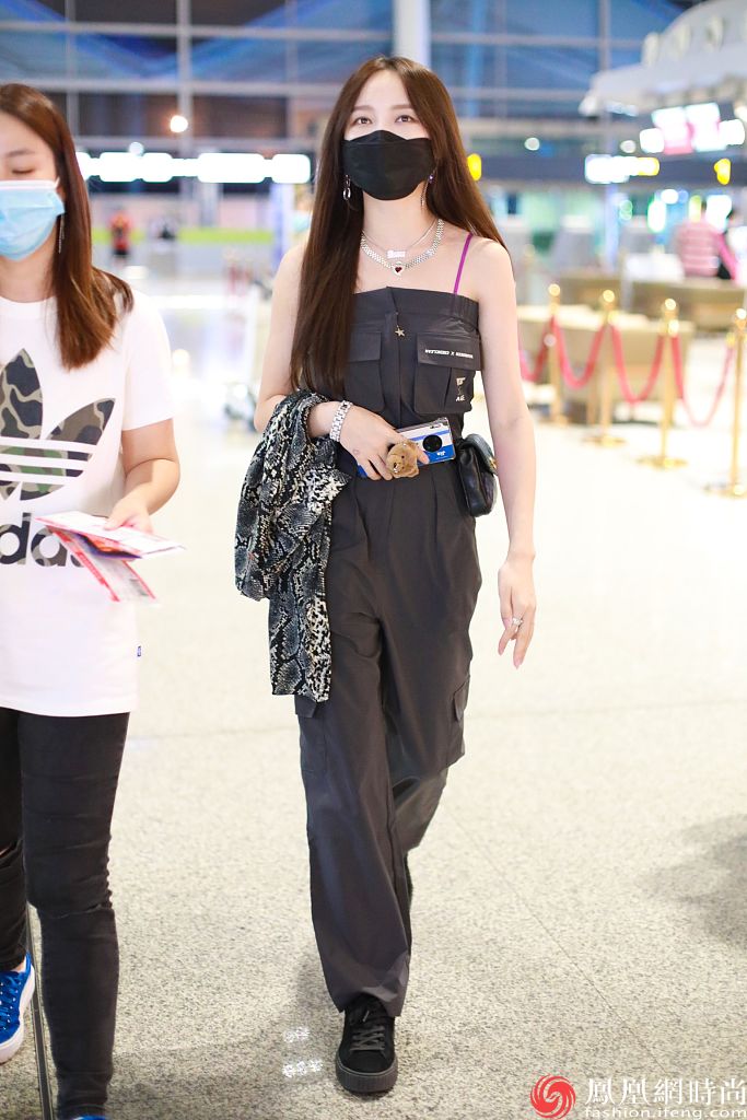 日前孟佳现身长沙机场,身穿黑色吊带连体裤,霸气性感。