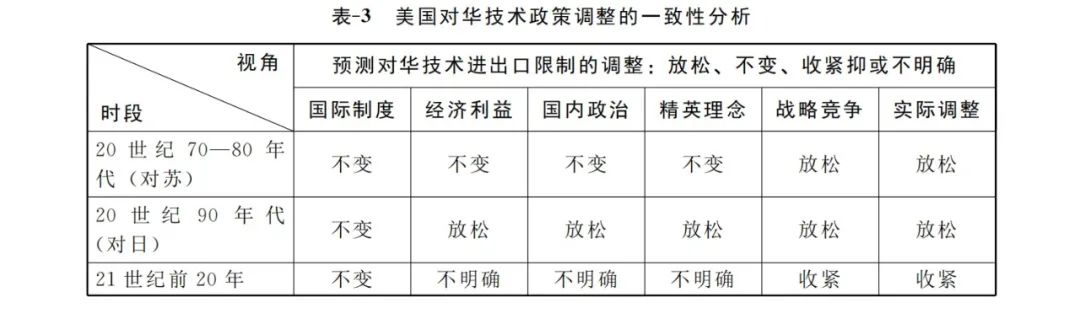 本文展示了20世纪70年代以来美国对华技术政策的调整。 作为世界政治的领导国,当美国面临直接、迫切的大国战略竞争压力时,更愿意通过放宽技术进口和出口限制来争取合作者,以应对竞争者的挑战。在面临苏联安全竞争压力与日本经济竞争压力对其世界政治领导权构成的冲击时,中国都是美国重要的合作伙伴。美国对华技术政策调整基于“利用强者打败更强者”和“利用将来的竞争者打败当前的竞争者”的逻辑。因此,在这两个时期,美国政府总体维持了对华开放的技术进口和出口政策,但当来自苏联和日本的竞争压力消失时,美国对华技术政策就面临新的调整压力,尤其是在既有压力消失的同时伴随中国经济与军事实力的快速成长,政策调整的动力就更为明显。 如表-3所示,运用“一致性分析”,基于大国战略竞争的分析较其他替代性解释能更为自洽、更一致地解释这三个时段美国对华技术政策的调整。