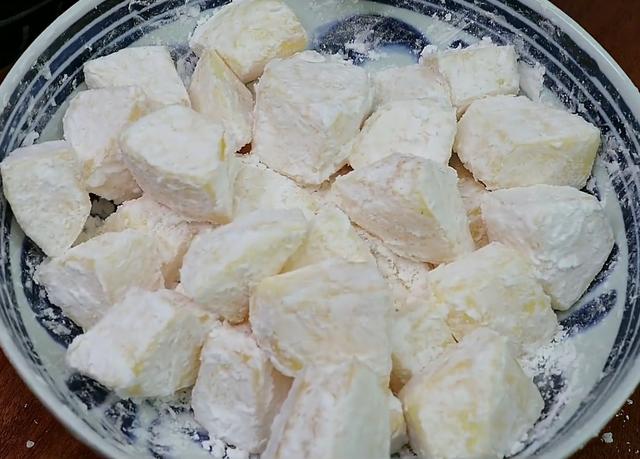 2、往苹果上先均匀撒上少许淀粉,翻动大碗几下后再撒上些淀粉,反复以上动作,等到苹果表面均匀地裹上一层相对较厚的淀粉为止;