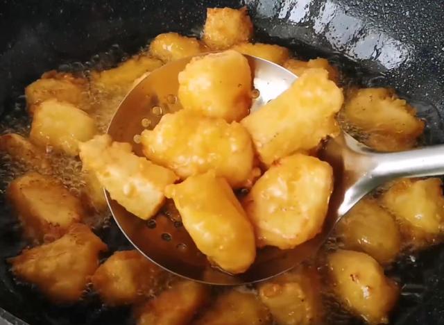 3、炸苹果,锅中加入适量的油,中火将油温至七成热的时候下入苹果,炸到苹果表皮金黄就可以捞出来控油备用了;