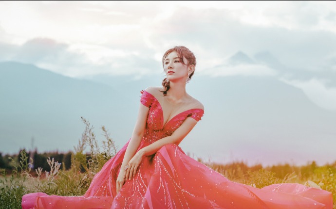 黄奕高马尾拍摄户外写真,粉色v领长裙秀性感身材