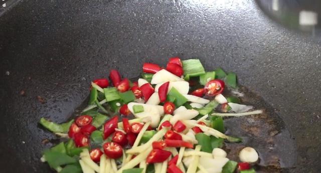4、锅中留少量底油,油热下入切好的姜、蒜、青椒、小米椒,开小火不断翻炒爆出香味;