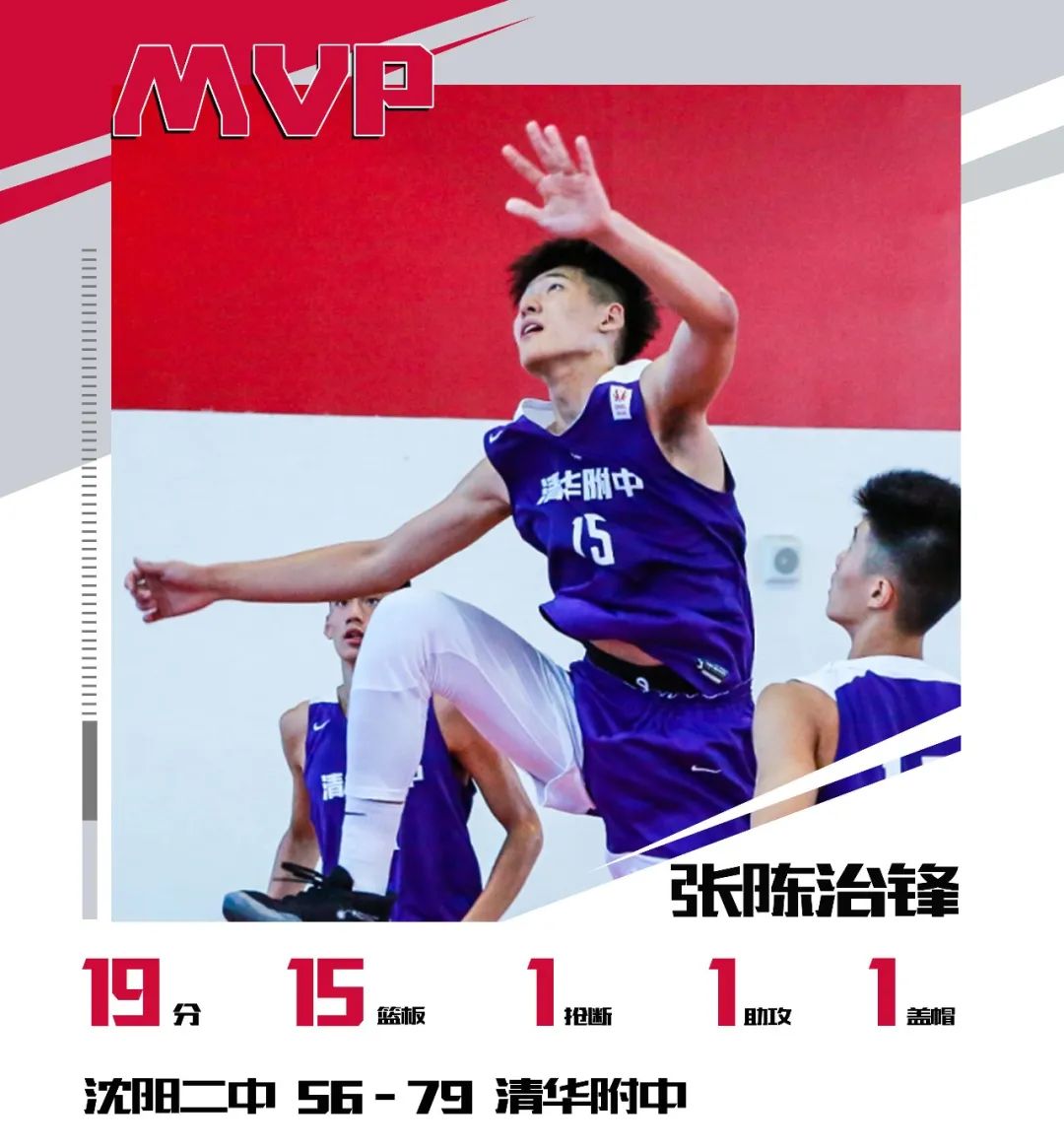 随后的比赛中清华附中持续放慢比赛节奏,连续通过稳定的掩护进攻保持得分,最终清华附中以79:56击败沈阳二中,晋级北区决赛,15号张陈治锋拿到19分15篮板1助攻1抢断1封盖获得本场MVP。