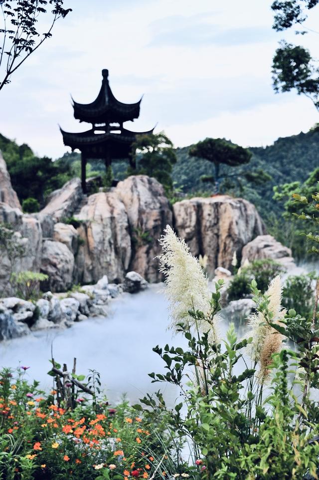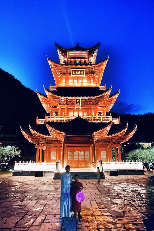 度假区最抢眼的建筑便是高26米的众妙阁,三层四柱纯木攒见顶结构,所在之处正是葛仙村阴阳交汇之处,夜晚众妙阁前大型实景光影秀,流光溢彩,亦真亦幻,带人们进入唯美飘渺的仙境。