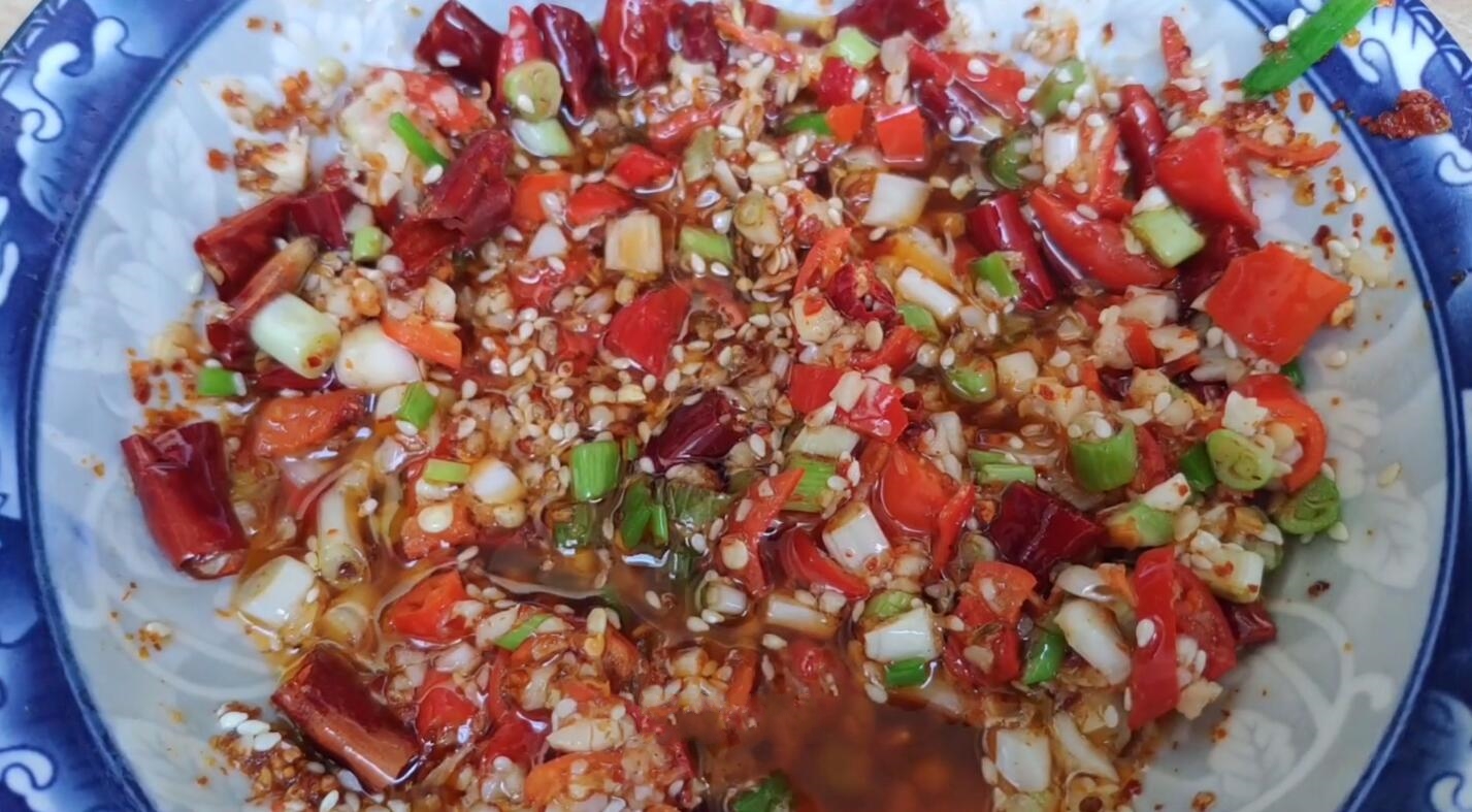 3、先调制一碗料汁,碗中加入切好的蒜末、小米椒、小葱、干辣椒段,然后再加入适量白芝麻、辣椒粉,放置一旁备用;再次起锅,锅中倒入适量食用油,油热下入一小撮花椒,开小火炸出花椒的香味,随后用漏勺过滤掉花椒,然后将热油淋入碗中,激发出香味,搅拌均匀后开始调味,加入适量盐、鸡精、生抽、白糖、香醋,再次搅拌均匀后放置一旁备用;