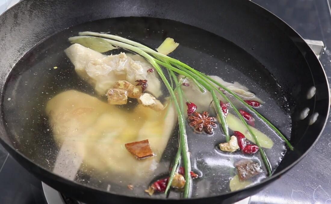 2、起锅,锅中倒入适量清水,将猪耳朵冷水下入锅中,然后下入几片姜片、小葱以及香料:桂皮、八角、香叶、干辣椒,再倒入适量料酒,开大火煮开后盖上锅盖煮20分钟;