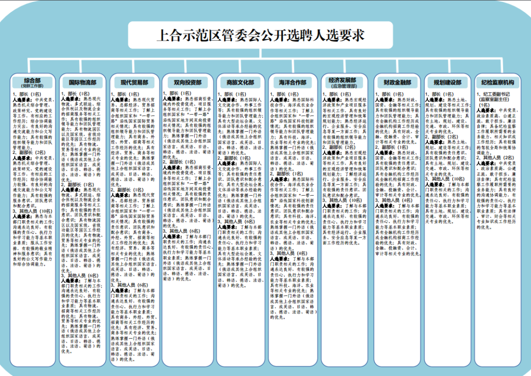其中, 上合示范区管委会拟公开选聘各岗位人员86名 ,包括综合部(党群工作部)13名:部长1名,副部长2名,其他人员10名;国际物流部8名:部长1名,副部长1名,其他人员6名;现代贸易部8名:部长1名,副部长1名,其他人员6名;双向投资部8名:部长1名,副部长1名,其他人员6名;商旅文化部8名:部长1名,副部长1名,其他人员6名;海洋合作部6名:部长1名,副部长1名,其他人员4名;经济发展部(应急管理部)13名:部长1名,副部长2名,其他人员10名;财政金融部6名:部长1名,副部长1名,其他人员4名;规划建设部13名:部长1名,副部长2名,其他人员10名;纪检监察机构3名:纪工委副书记(监察室副主任)1名,其他人员2名,由青岛市纪委会同上合示范区按照有关规定组织选聘。