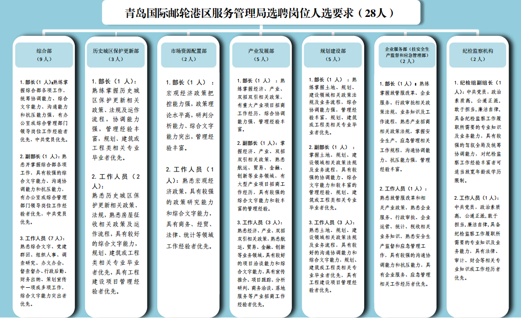 青岛国际邮轮港区管委会拟公开选聘部分岗位人员28名 ,包括综合部9名:部长1名,副部长1名,工作人员7名;历史城区保护更新部3名:部长1名,工作人员2名;市场资源配置部2名:部长1名,工作人员1名;产业发展部5名:部长1名,副部长1名,工作人员3名;规划建设部5名:部长1名,副部长1名,工作人员3名;企业服务部(挂安全生产监督和应急管理部)2名:部长1名,工作人员1名;纪检监察机构2名:纪检组副组长(按中层正职配备)1名,工作人员1名,由青岛市纪委会同邮轮港区服务管理局按照有关规定组织选聘。