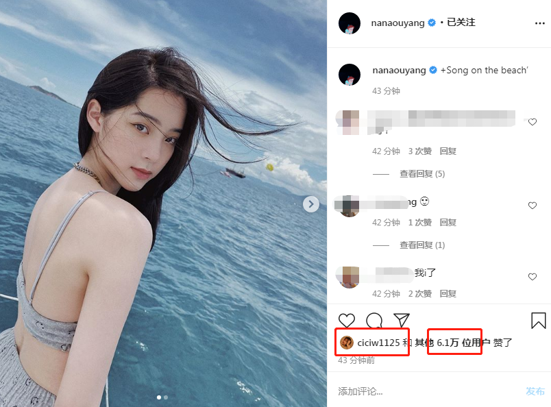 8月23日,欧阳娜娜在个人社交平台分享了两张出海游玩的美照,照片还获得了汪峰女儿小苹果的点赞。