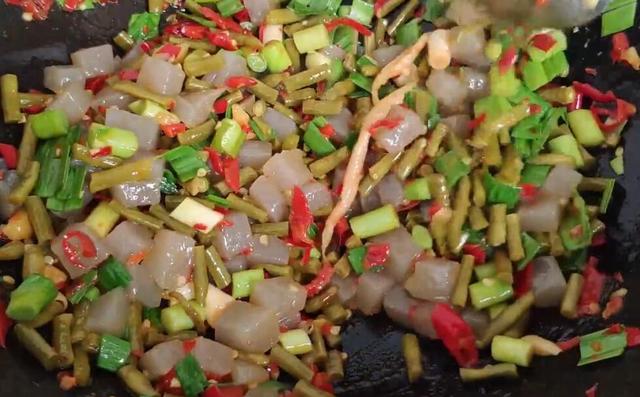 4、倒入焯好水的魔芋豆腐,翻炒均匀后开始调味,下入适量盐、生抽,再次翻炒均匀后开中小火焖煮3分钟,然后下入切好的蒜苗,翻炒片刻后加入少量水淀粉勾芡,翻炒几下就可以关火出锅了,盛入盘中,这道家常魔芋豆腐炒酸豆角就做好了,魔芋豆腐酸辣入味,开胃又下饭,吃着非常过瘾。