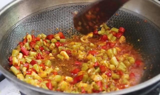 3、再次起锅,锅中倒入适量食用油,油热下入剁椒酱,开小火不断翻炒出香味,然后下入切好的泡椒、蒜粒、酸豆角,再次翻炒出香味;